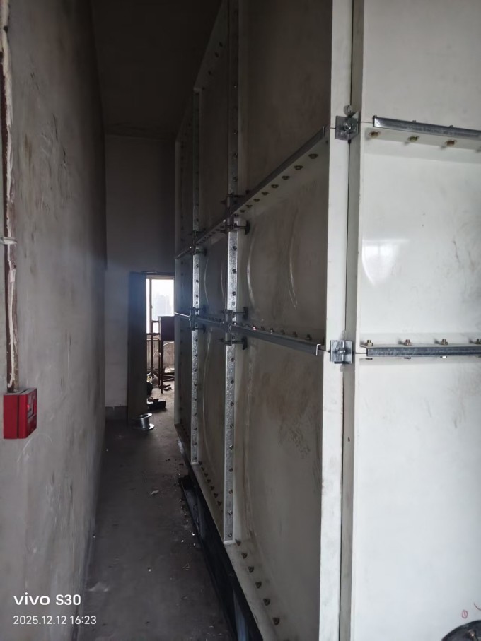 SMC水箱組裝就是用模壓的小塊,到施工現場組裝成大的水箱。外面要用角鋼進行固定的,角鋼搭出個水箱模型,在上面鋪玻璃鋼平板,拼縫處再現場多糊幾層方格布...